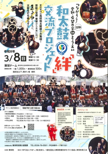 | 時間: | 10時00分 入場整理券配布 10時30分 売店OPEN 12時00分 開場 12時30分 開演 「楽~RAKU~」合同演奏(高校生・志多ら) 参加団体演奏 14時30分 和太鼓集団「志多ら」演奏 15時20分 創作曲「結心」(高校生・志多ら) 15時45分 終演予定 |
