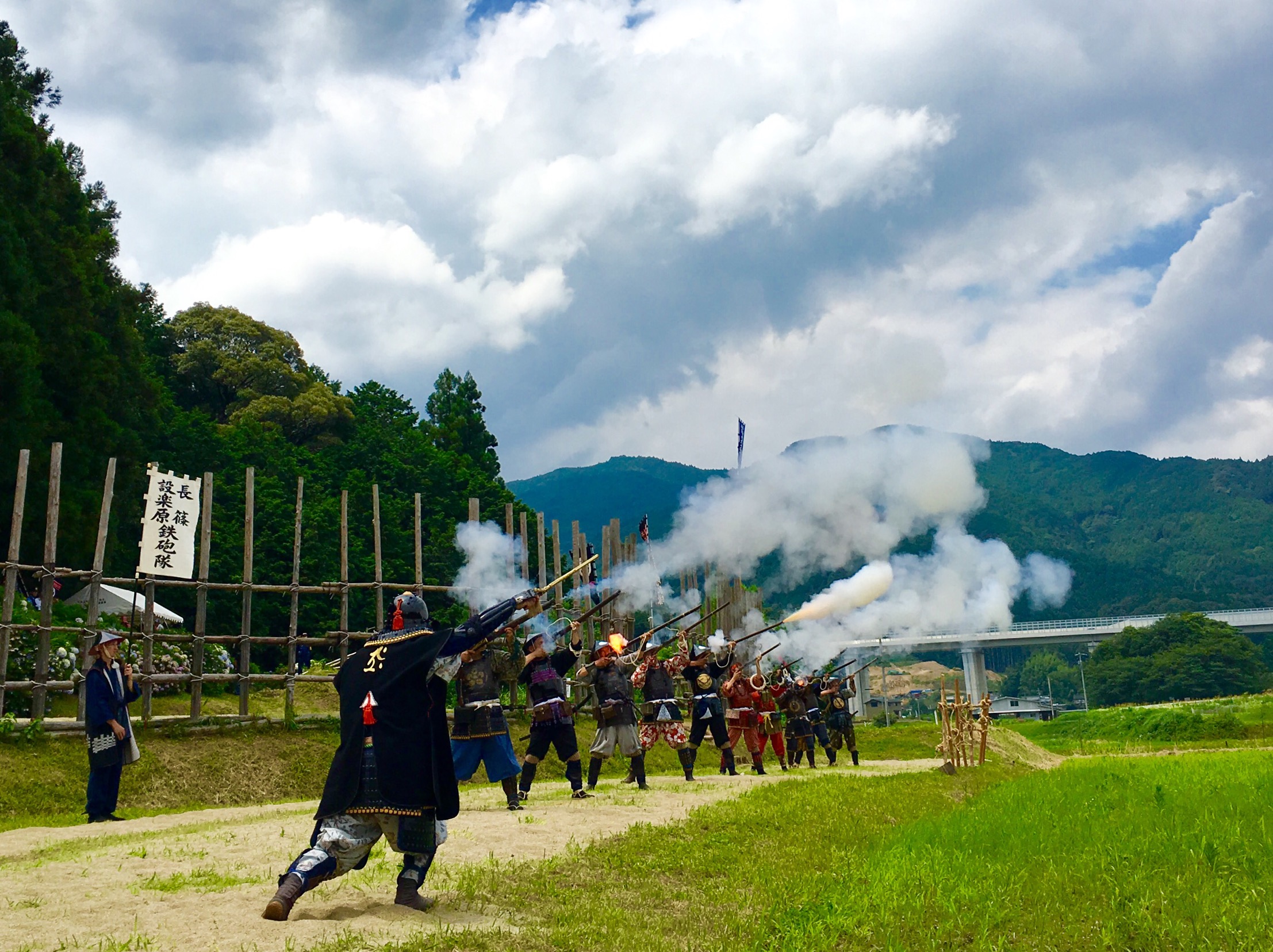 日本で初めて鉄砲が大量に使われた、1575(天正3)年の長篠・設楽原の戦い。その設楽原古戦場を舞台に火縄銃の演武や小・中学生による武者行列、子ども武者による馬防柵演武などが行われ、当時の様子が再現されます。