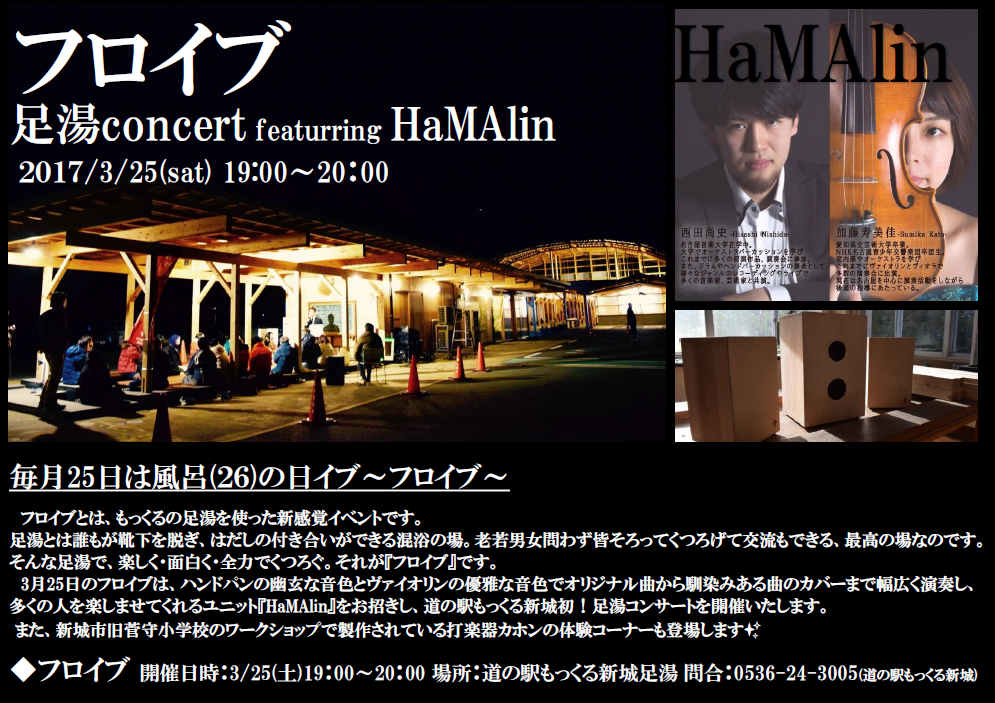 ハンドパンの幽玄な音色とヴァイオリンの優雅な音色でオリジナル曲から馴染みあるカバー曲まで幅広く演奏して老若男女問わず多くの方を楽しませてくれるユニット『HaMAlin(ハマリン)』をお招きし、道の駅もっくる新城さん初の試み足湯コンサートを開催します!