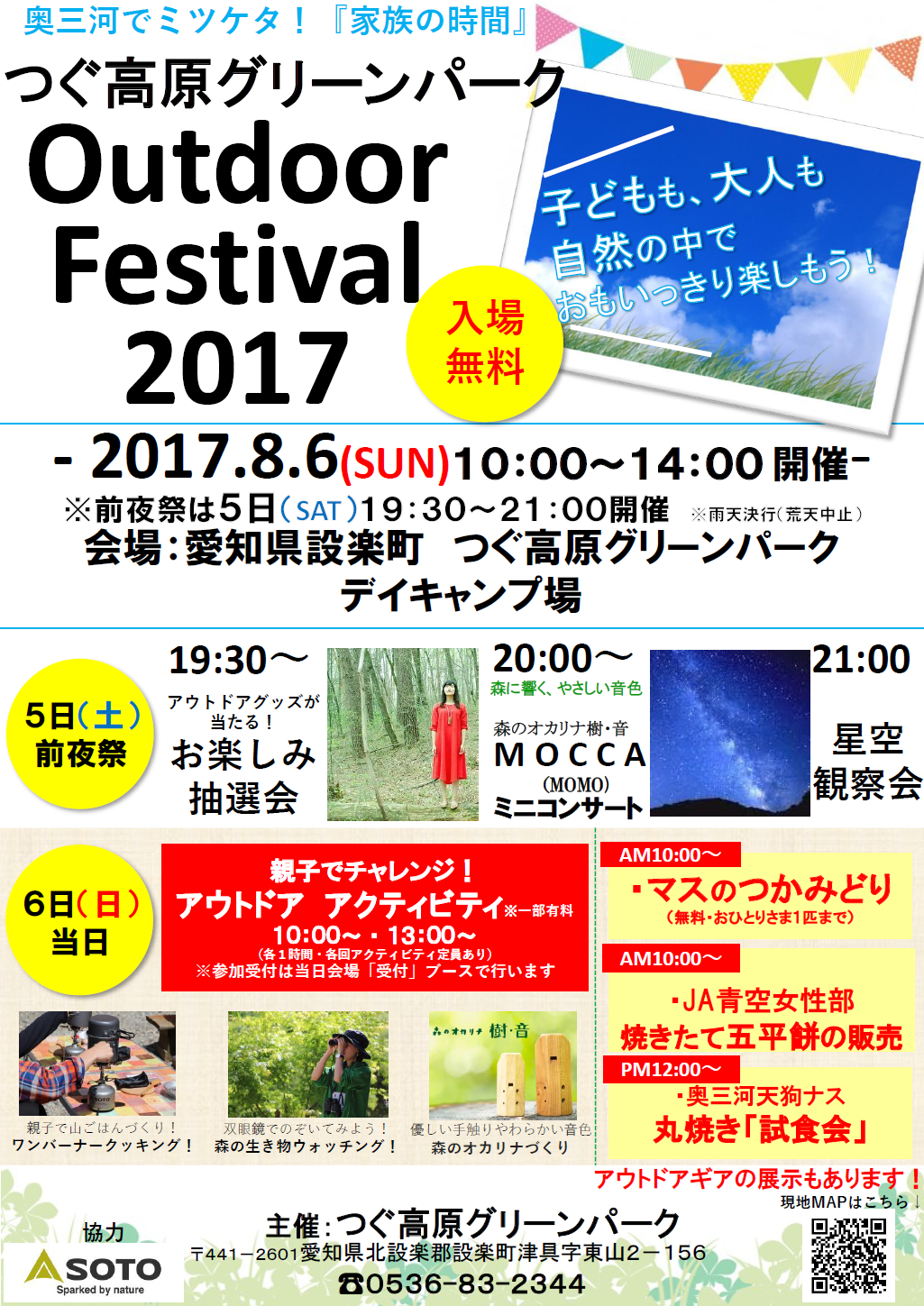 愛知県設楽町津具にあるキャンピングパーク「つぐ高原グリーンパーク」にて、つぐ高原グリーンパークOutdoorFestival2017開催します!(入場無料)