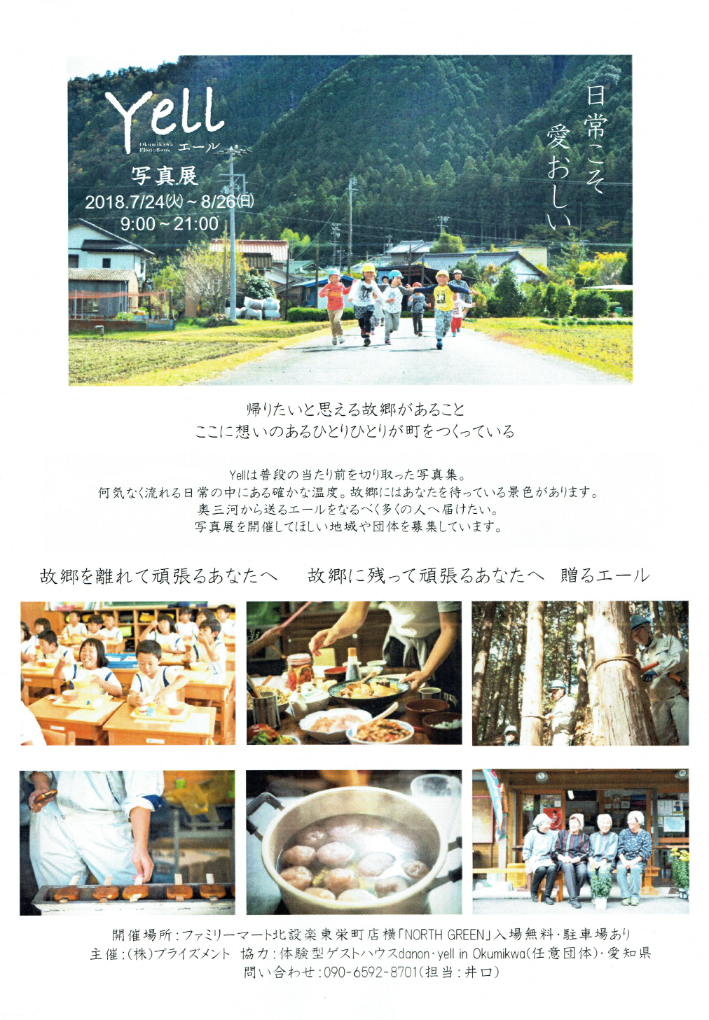 昨年愛知県が製作した写真集YELL(エール)の作品展が、ファミリーマート北設楽東栄町店横「NORTH GREEN」にて開催されています。