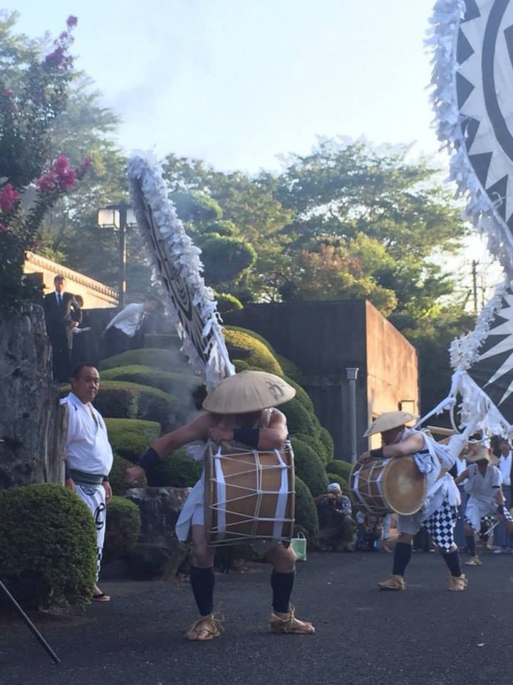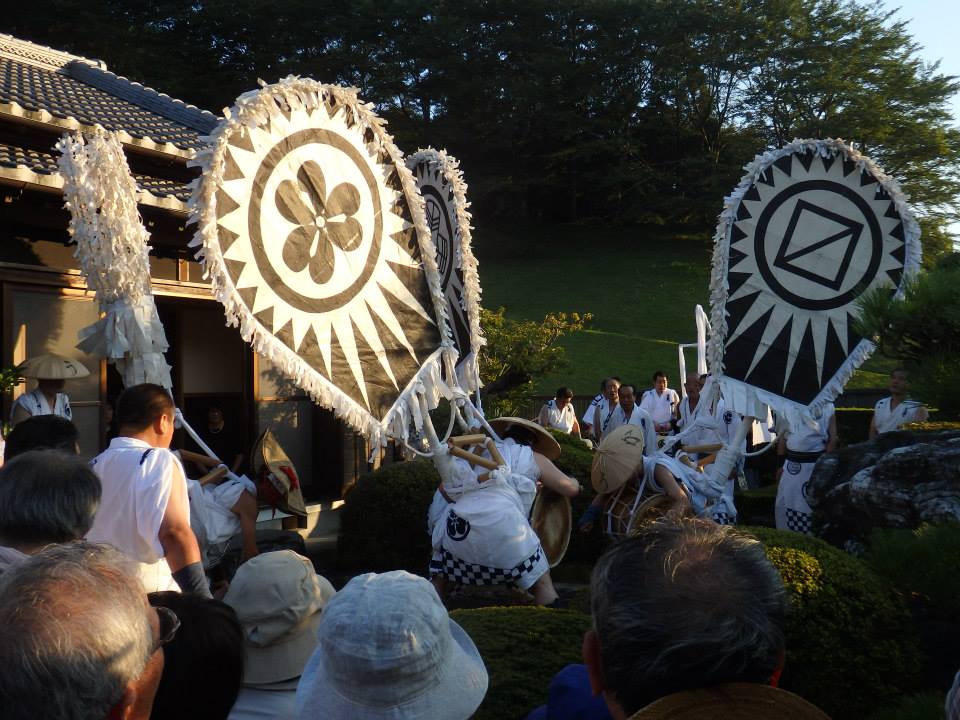 背中に高さ2.1mにもなる大団扇を背負い、腹には直径50cmの太鼓を抱え、初盆の家々を回ります。