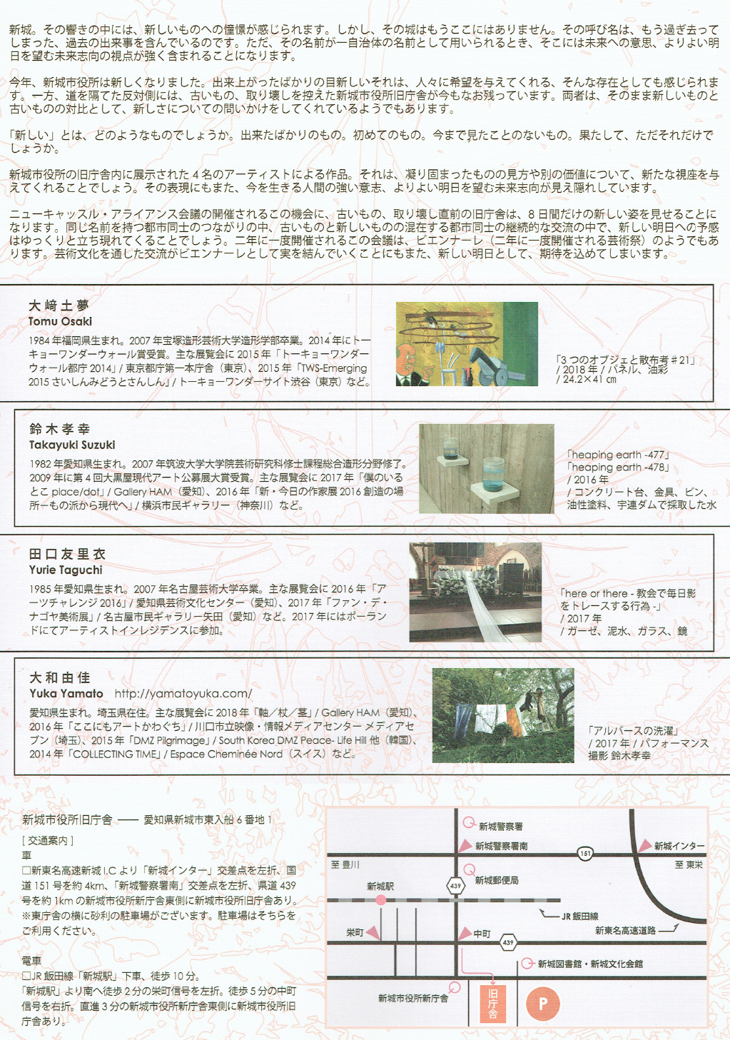 2018年10月に新城市にて開催されるニューキャッスルアライアンス会議関連企画として、『新城現代アート展 新しい明日 Beyond The Previous Day』が新城市役所旧庁舎にて開催されます。
