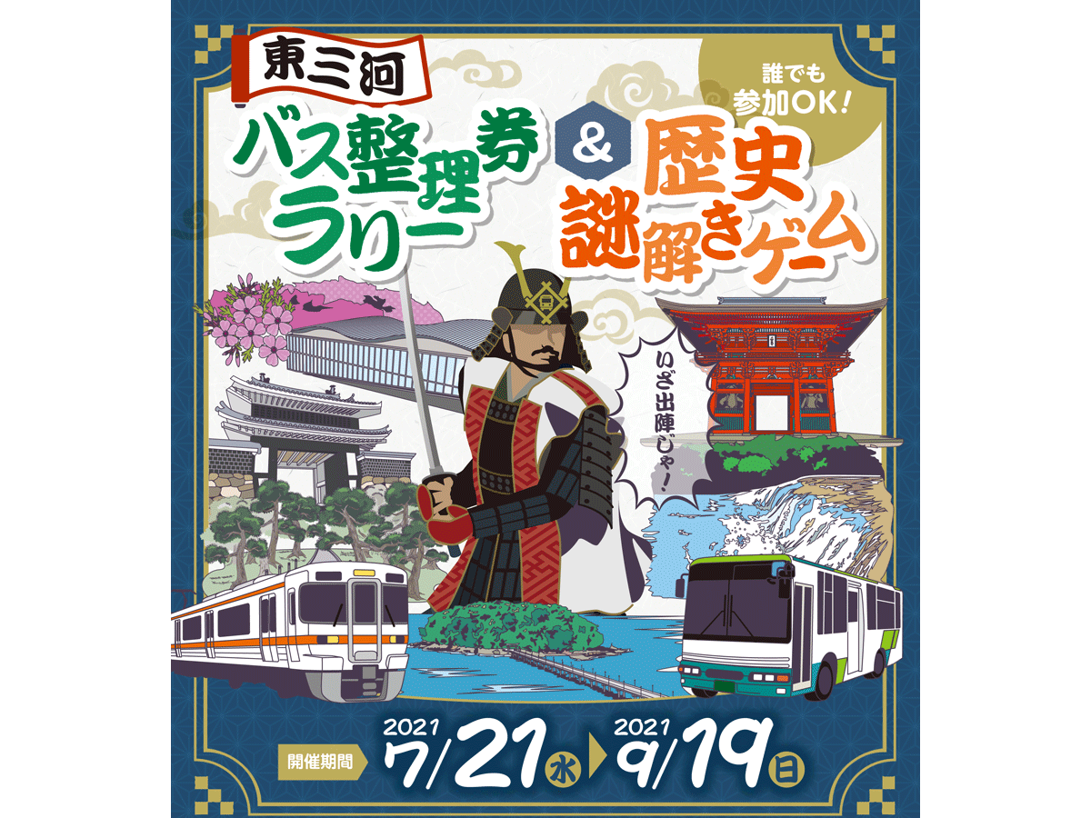 また、期間中には「東三河バス整理券ラリー&歴史謎解きゲーム」を併せて開催しますので、この夏は積極的に公共交通を利用して夏休みの思い出を作りましょう!抽選でお菓子の詰め合わせなどが当たります!
