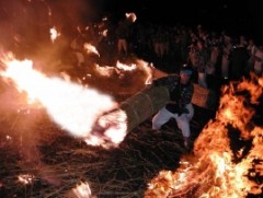 火おんどりは19:00から採火式,20:00からの御清めを経て,21:00から信玄塚で踊りが行われる。信玄塚での踊りがメインでこれを見るために多くの観光客が訪れる。