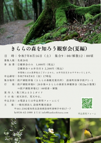 | 場所: | 集合場所:きららの森観光案内所駐車場(段戸湖駐車場) |
