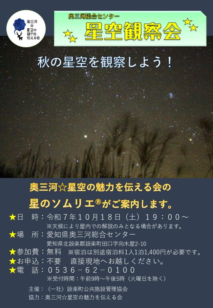 10月18日(金)奥三河総合センターにて星空観察会を開催いたします。今回のテーマは『秋の星空を観察しよう』場所:奥三河総合センター(北設楽郡設楽町田口字向木屋2-10)料金:無料申込:不要のんびりされたい方は会場の奥三河総合センターへの宿泊もおすすめですよ♪※星が見えない場合は室内で解説のみとなります※奥三河の夜は大変冷え込みますので防寒具のご用意をお願いいたします。【詳細、お問い合わせ】0536-62-0100(火曜休み、9:00~17:00)