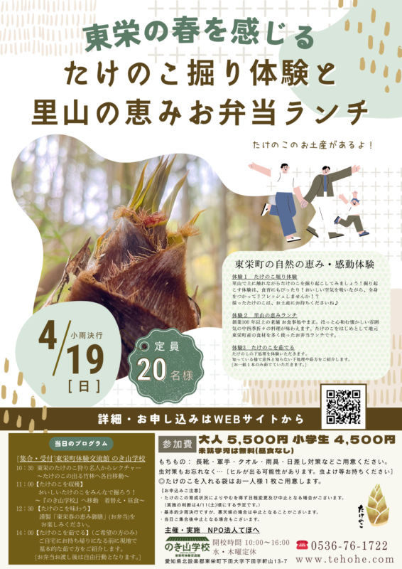 東栄町の里山で春限定のたけのこ掘り体験を開催します。地元のたけのこ掘り名人と一緒に竹林へ入り、自分で掘った旬のたけのこを収穫できます。体験後は里山食材を使った特製お弁当ランチ付き。自然・食・地域文化・食育を一度に体験できる、家族で楽しめる食育体験として人気の春イベントです。愛知でたけのこ掘り体験や春の自然体験を探している方におすすめです。