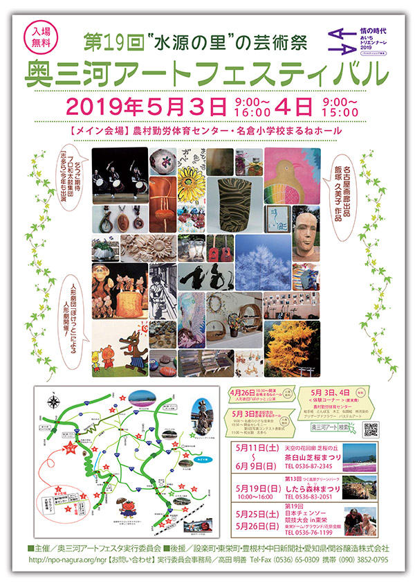毎年ゴールデンウィークの期間中、標高600mの名倉高原を舞台に様々なアート作品が展示紹介されるアートフェスティバルが開催されます。これはプロ、アマ、町内外、大人子供を問わず幅広い方々に、陶芸や木工、絵画、手芸など思いの詰まった貴重な手作り作品をご提供いただき行われるものです。