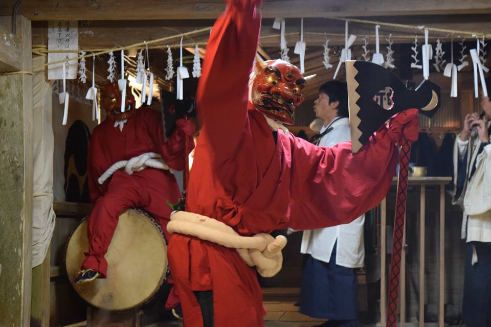 黒尉の面をかぶって叫びながら鼻をつまんで飛び回る 「はなうり」 や、ボロ衣をまとい、シラミをとる真似をする 「シラミふくい」、みかんを食べる獅子舞「どんずく」 等、神々の素朴な舞とユーモアたっぷりのお祭りです。