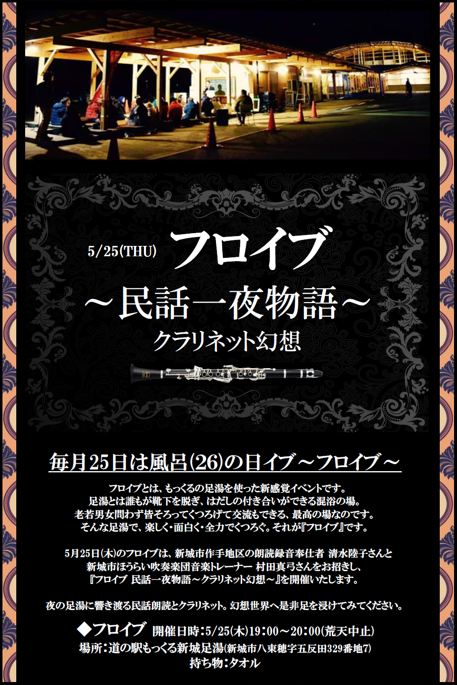今回のフロイブは新城市作手地区の朗読録音奉仕者 清水陸子さんと、新城市ほうらい吹奏楽団から音楽トレーナー 村田真弓さんをお招きし、『民話一夜物語~クラリネット幻想~』を開催いたします。