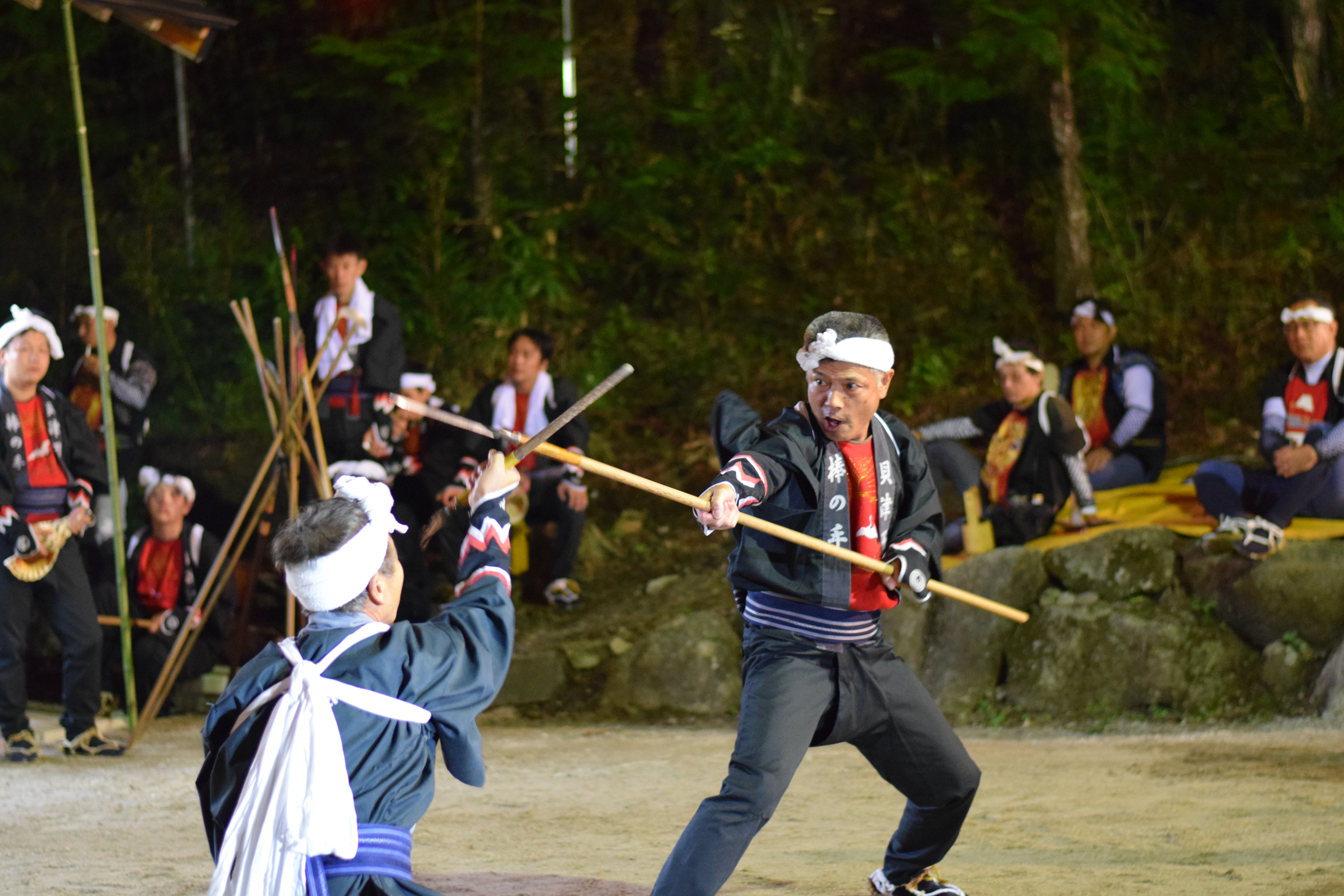 棒の手の演技者たちは祭礼当日、当地に棒の手を招来した原田家から出発、高張り提灯を先頭に、年行事、法螺貝、演技者が二列縦隊で神社へ向かいます。拝殿前で修祓を受け、少年一手、青壮年二手を奉納し、演技場へ移ります。演技場を塩で清め、法螺貝の響きで、六尺棒、槍、薙刀、長柄鎌、真剣、十手を手にした演技者たちの勇壮な演技、妙技が披露され、観衆は手に汗をにぎって見物します。演技者たちは、武術の奥義を舞踊として表現していますが、心底には武術の気合が伝承されているようです。