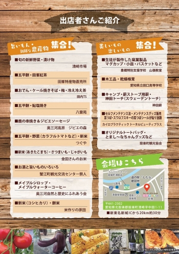 会場には、新鮮な農産物や加工品、手作り雑貨、グルメコーナー等設楽町の自慢の産品が並びます♪