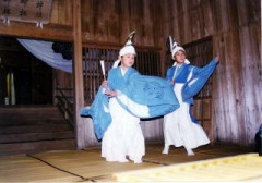 拝殿正面の中央に舞手、左手に囃し方(太鼓一人、笛二人、拍子木一人)、右手と正面入り口に氏子が着座して、宵祭りの祭典が始まります。開扉、神饌献上などの儀式に続き、神官の厳かな祝詩奏上の中に「神の御前に奏で祀る三番叟の歌舞の技をもめぐしうむがしとみそなしまして・・・」の一文が拝殿に届いてきます。祝詞奏上の後、お払いを受けて三番叟が始まります。舞の途中で足をトントンと四回踏む所作もあり、ここでは舞手を踏みコと呼んでいます。子供三番叟の起源については明瞭ではありませんが、小代城主(中世末期)の病気平癒のために村人が奉納したのが始まりといいます。舞は氏子の家内安全、五穀豊穣などを願って、氏子の戸数だけの番数を繰り返し踏んでいます。