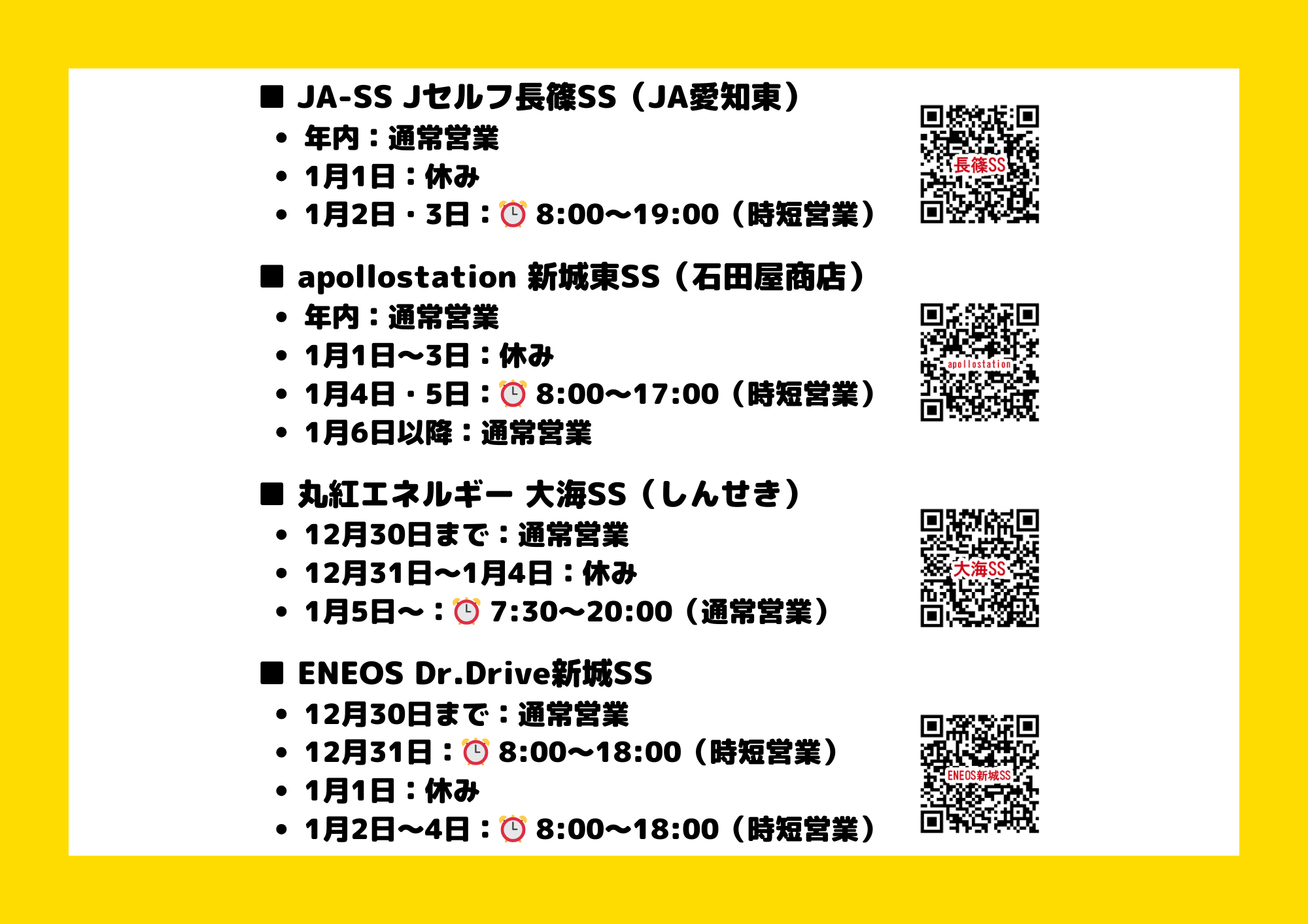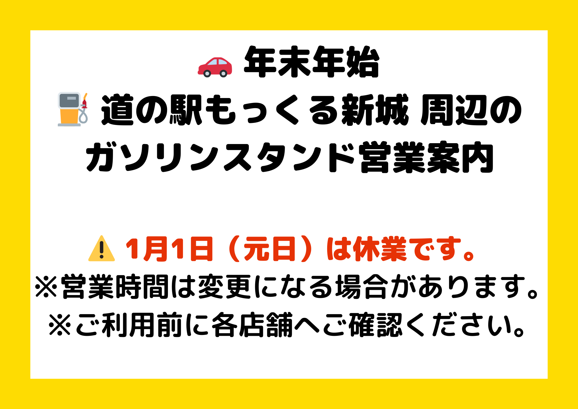年末年始のガソリンスタンド営業について(道の駅もっくる新城 周辺)年末年始期間中、道の駅もっくる新城周辺のガソリンスタンドは、営業時間の変更および休業がございます。特に、1月1日(元日)は全店休業となりますので、ご来訪前・ご出発前の給油をおすすめいたします。各店舗の営業日・営業時間は画像のとおりです。※営業時間は変更となる場合があります。※ご利用前に各店舗へご確認ください。