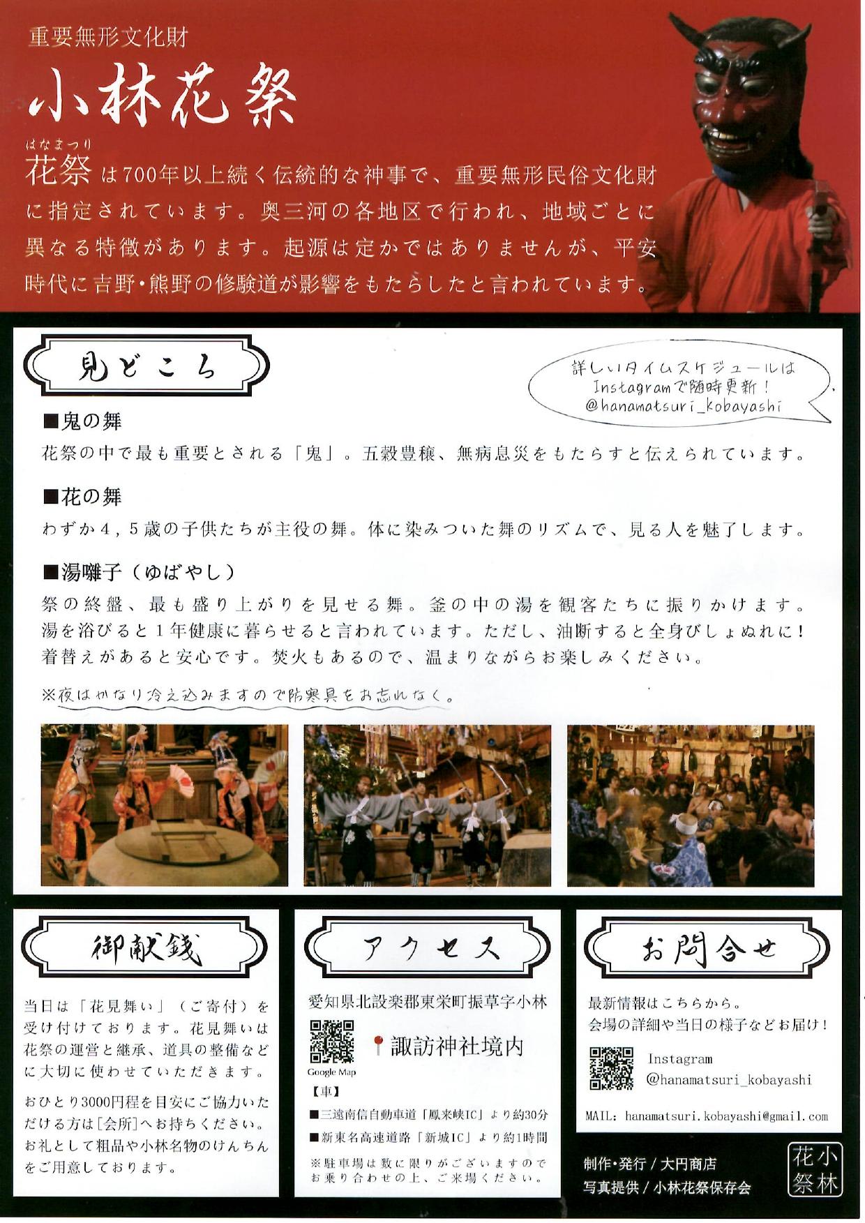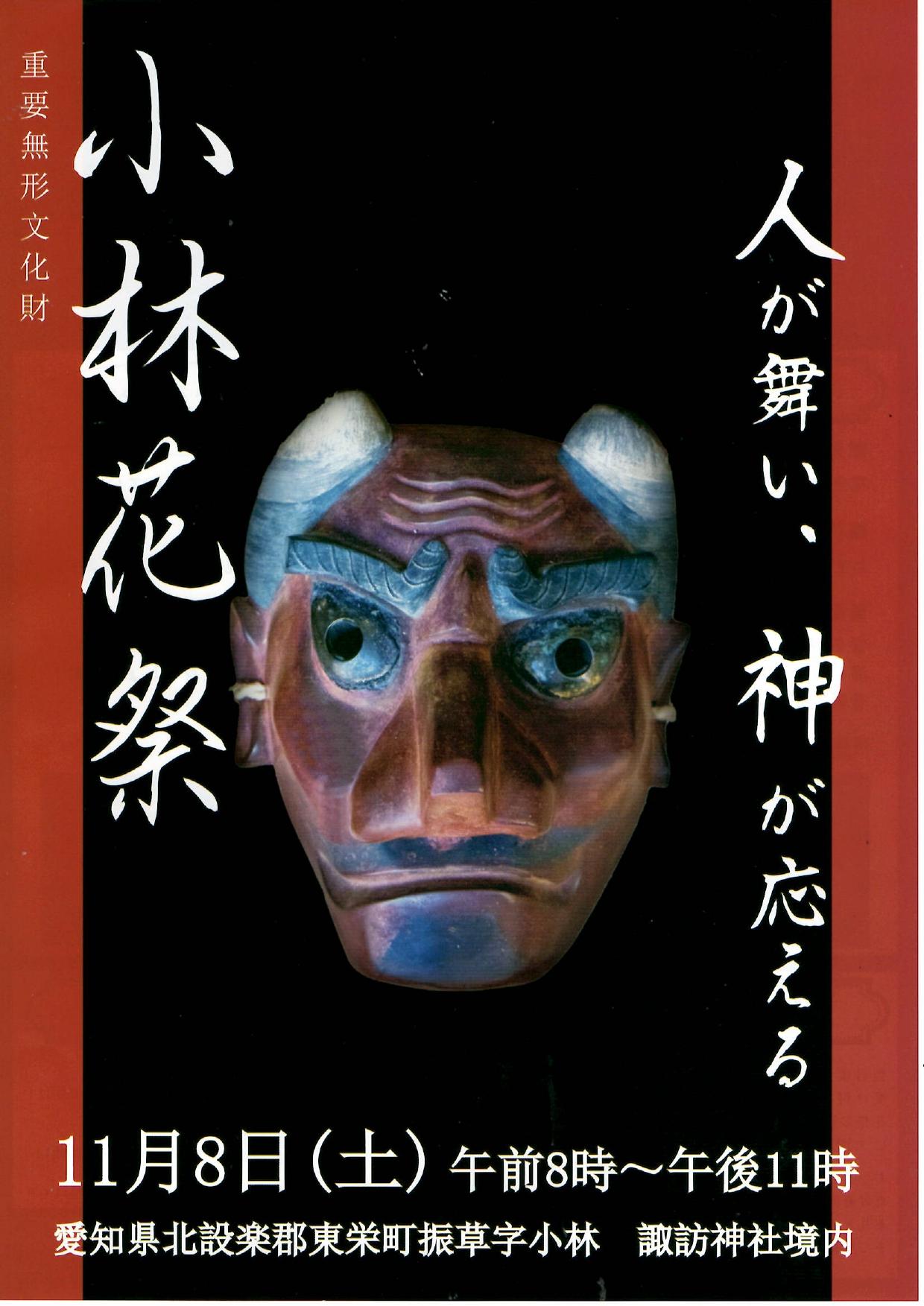 東栄町各地に伝わる花祭りには「振草系」、「大入系」、「大河内系」の3系統があるとされ、小林の花祭は唯一の「大河内系」といわれています。