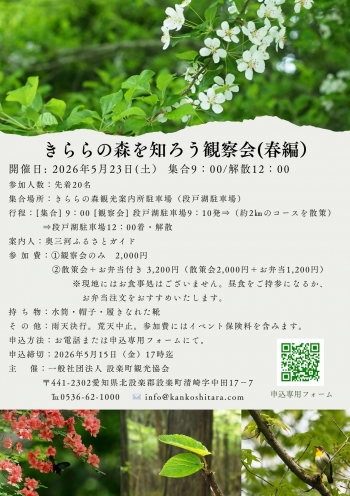 | 時間: | [集合] 9:00 [観察会] 段戸湖駐車場9:10発⇒(約2㎞のコースを散策)⇒段戸湖駐車場12:00着・解散 |