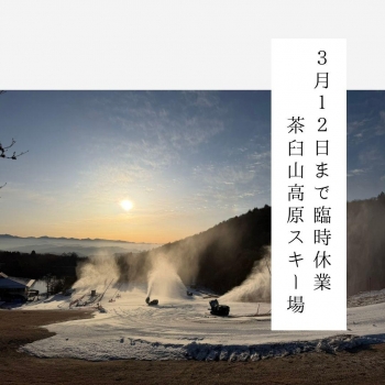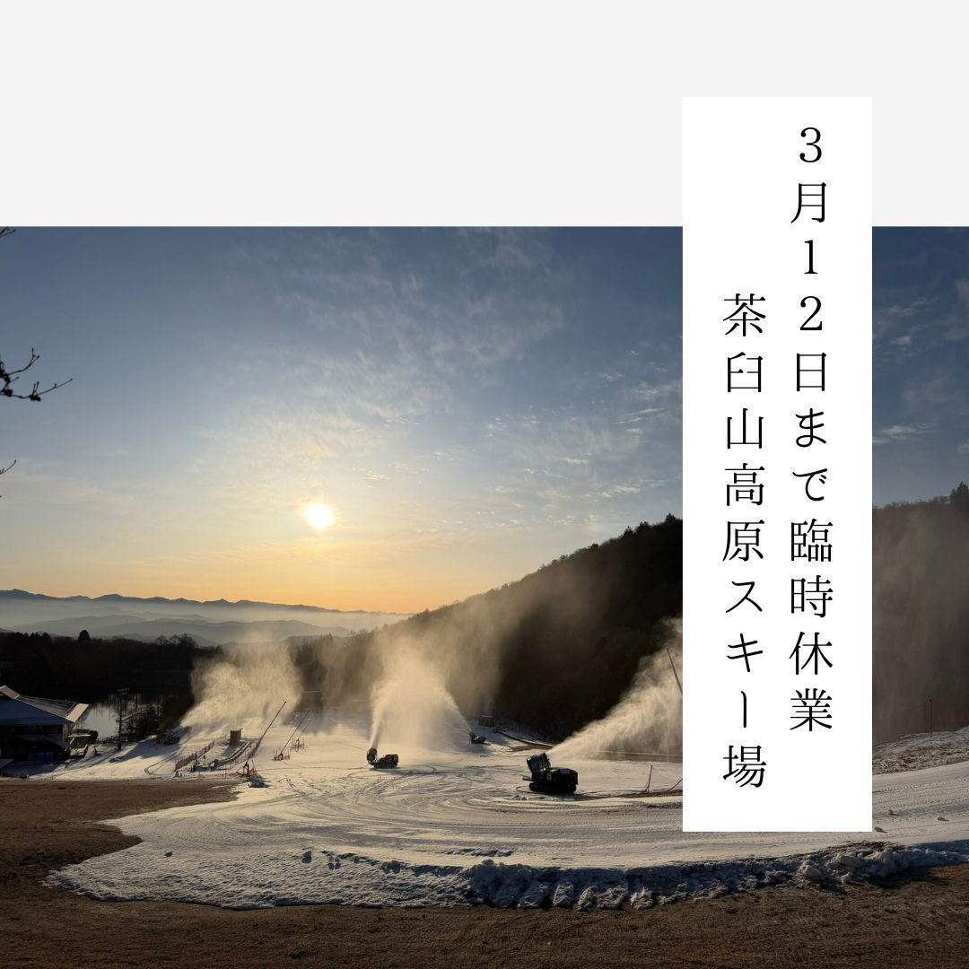 ゲレンデ保持のため3月12日(木)まで臨時休業いたします。営業は3月13日(金)より再開予定です。ご来場を予定されていた皆さまにはご不便をおかけしますが、より良いコンディションでお楽しみいただくための作業となりますので、何卒ご了承ください。詳細は【茶臼山高原ホームページ】をご確認ください↓