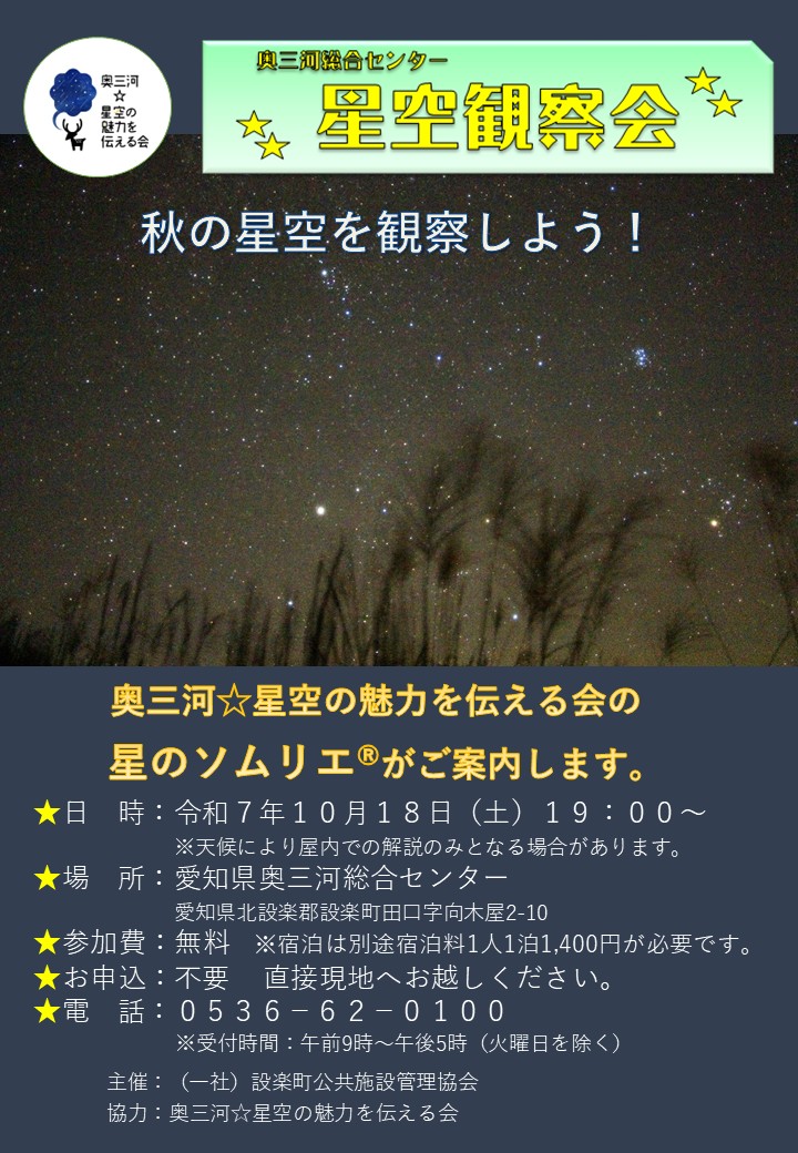 - 10月18日(金)奥三河総合センターにて星空観察会を開催いたします。 今回のテーマは『秋の星空を観察しよう』 場所:奥三河総合センター(北設楽郡設楽町田口字向木屋2-10) 料金:無料 申込:不要 のんびりされたい方は会場の奥三河総合センターへの宿泊もおすすめですよ♪ ※星が見えない場合は室内で解説のみとなります ※奥三河の夜は大変冷え込みますので防寒具のご用意をお願いいたします。