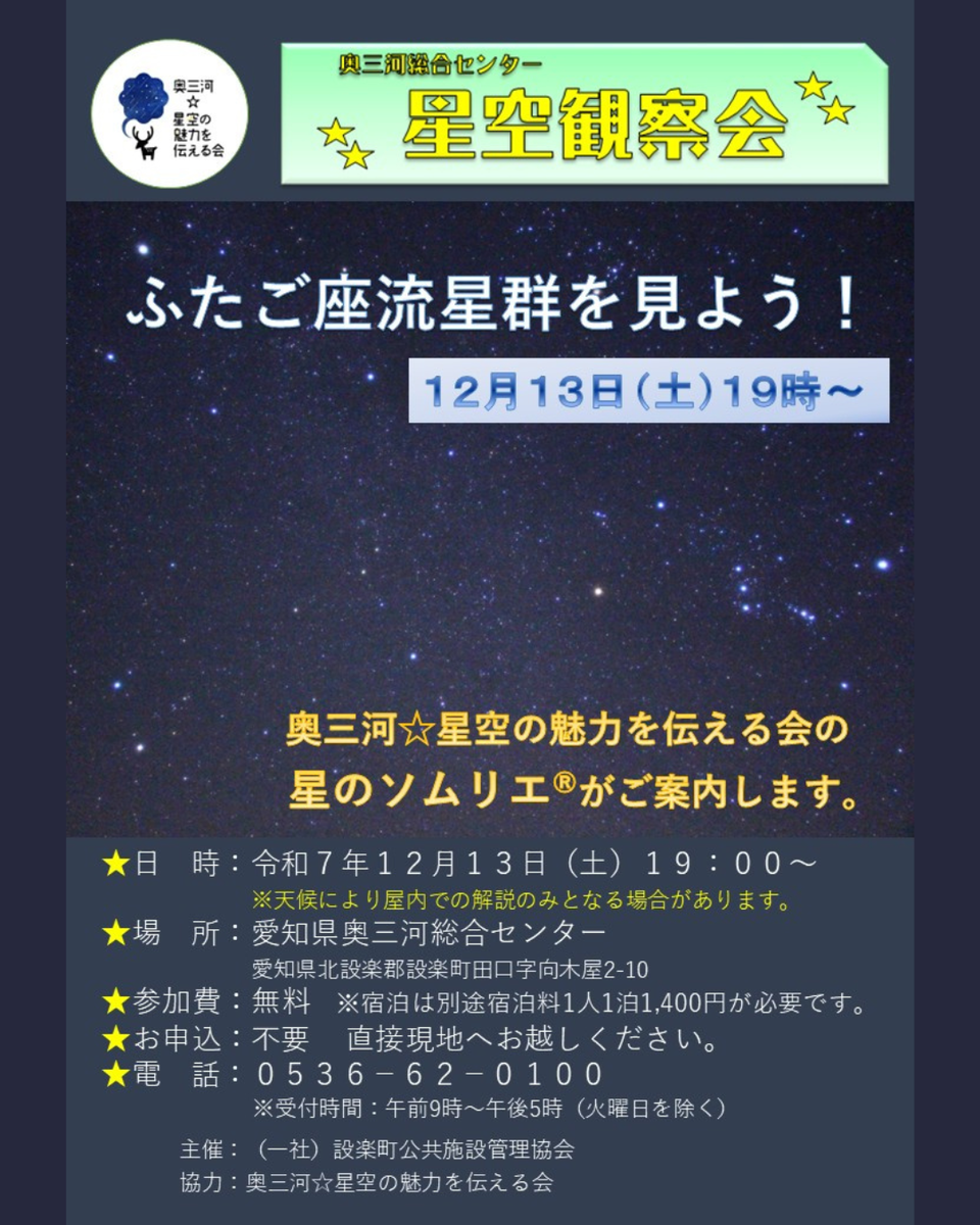 - 奥三河総合センター 星空観察会開催 奥三河総合センターにて、 12月13日(土)に星空観察会を開催いたします。 今回のテーマは「ふたご座流星群を見よう」。 冬の澄んだ夜空を眺めながら、一緒に流星群を観察しませんか? 場所:奥三河総合センター (北設楽郡設楽町田口字向木屋2-10) 参加費:無料 申込:不要